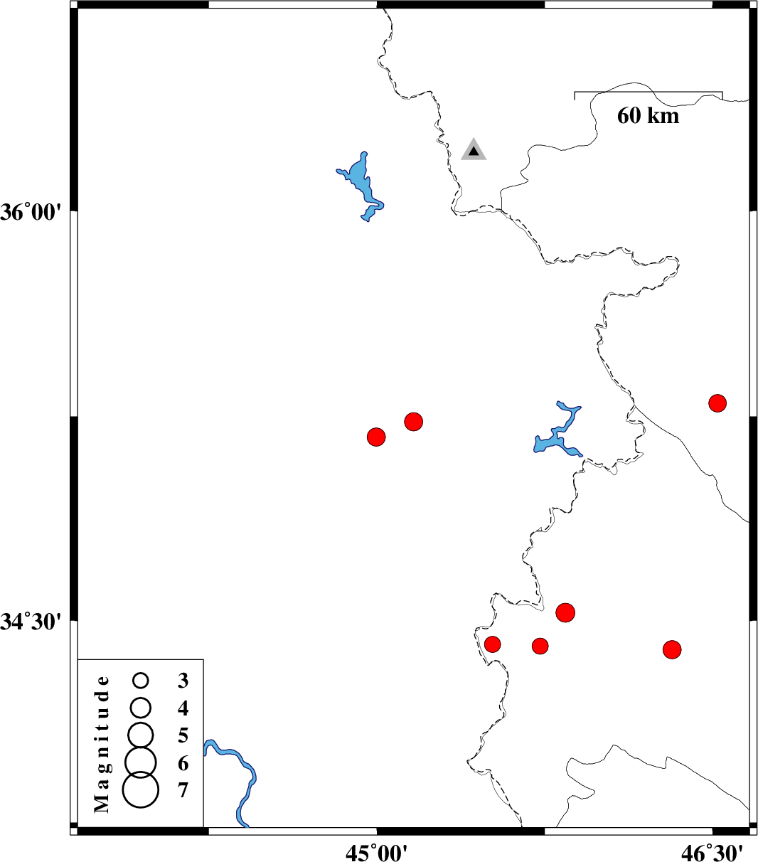 | 2023/06/25 | 08:52:50.5 | 12:22:50.5 | 34.392 | 46.318 | 10 | ML:3.6 | Kermanshah Province, 40 km -East of Sar-e pol-e zahab | ||