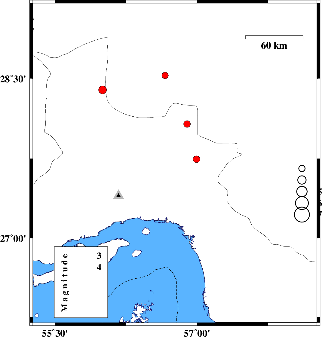 | 2023/07/21 | 06:23:27.7 | 09:53:27.7 | 27.699 | 56.766 | 12 | ML:3.2 | Hormozgan Province, 56 km North-West of Dehbarez | ||