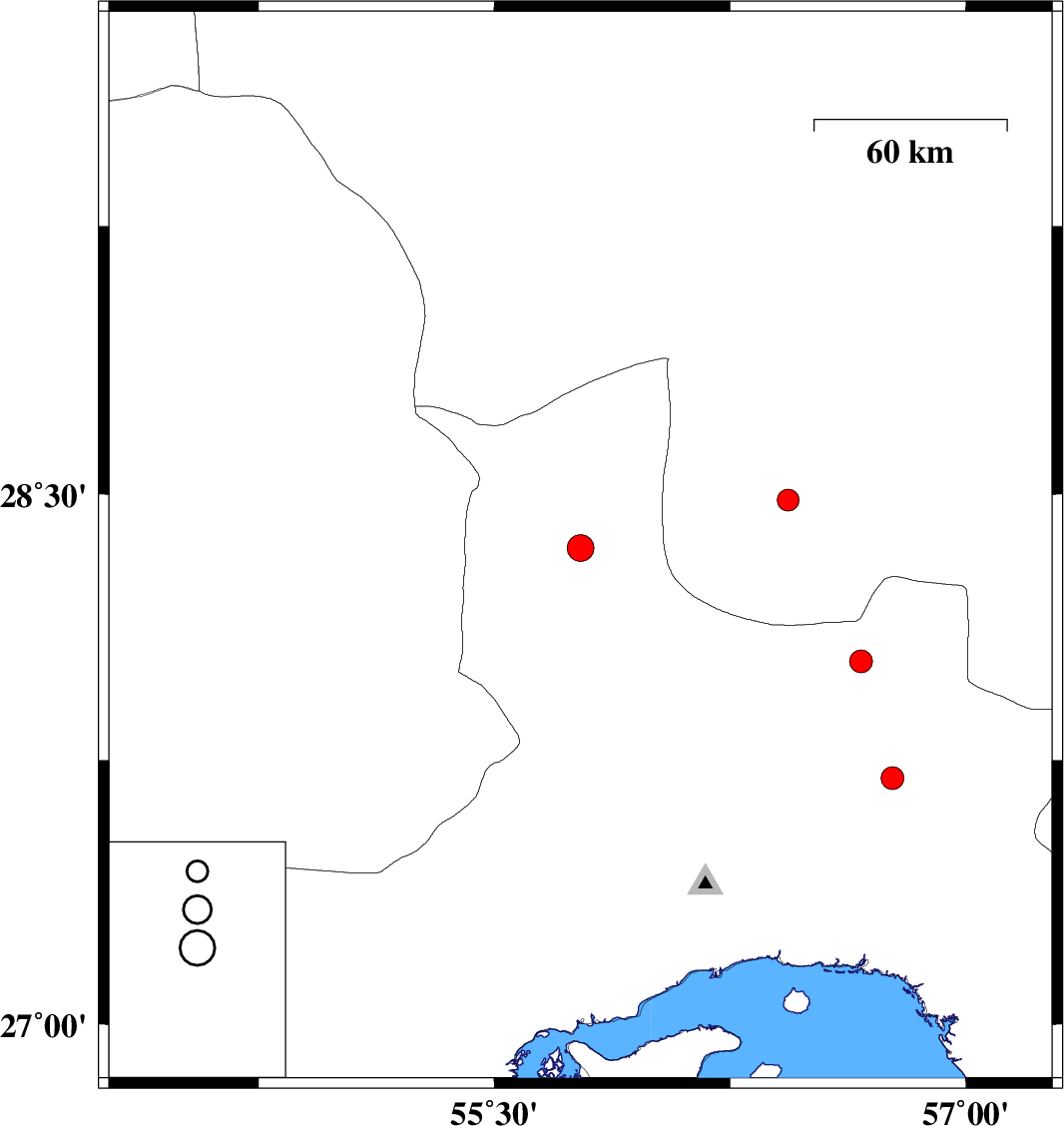 | 2023/07/21 | 00:39:00.8 | 04:09:00.8 | 28.348 | 55.774 | 12 | ML:3.8 | Hormozgan Province, 13 km -West of Hajiabad | ||
