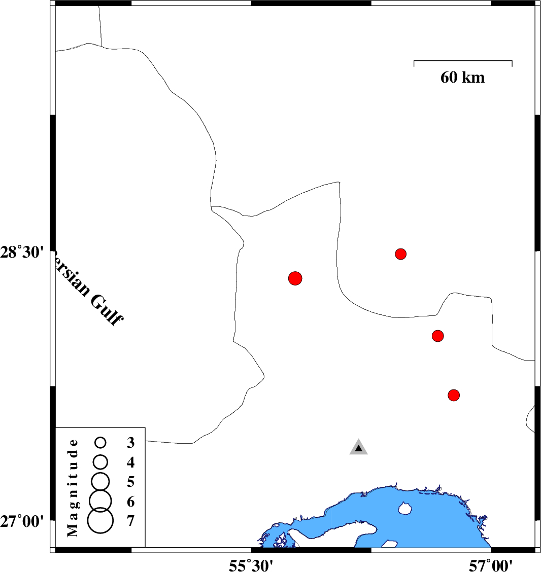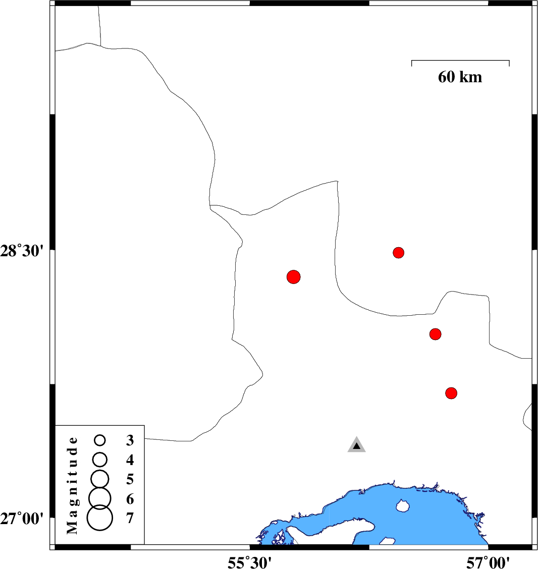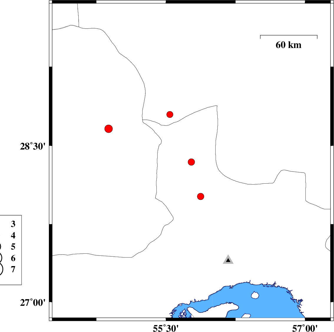 | 2023/07/16 | 19:25:56.2 | 22:55:56.2 | 27.24 | 54.484 | 15 | ML:4 | Hormozgan Province, 13 km -East of Bastak | ||
