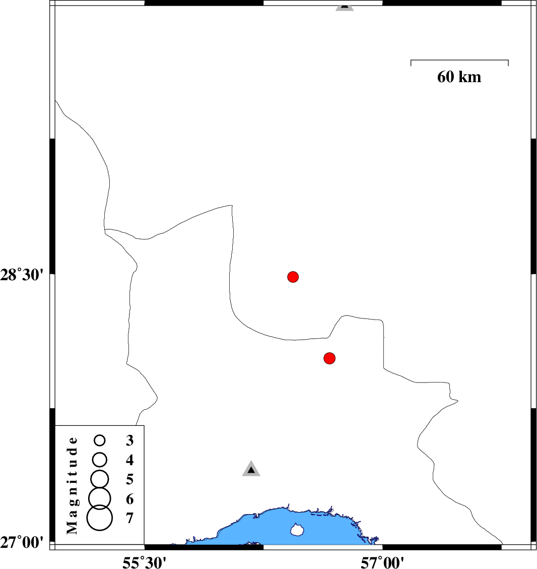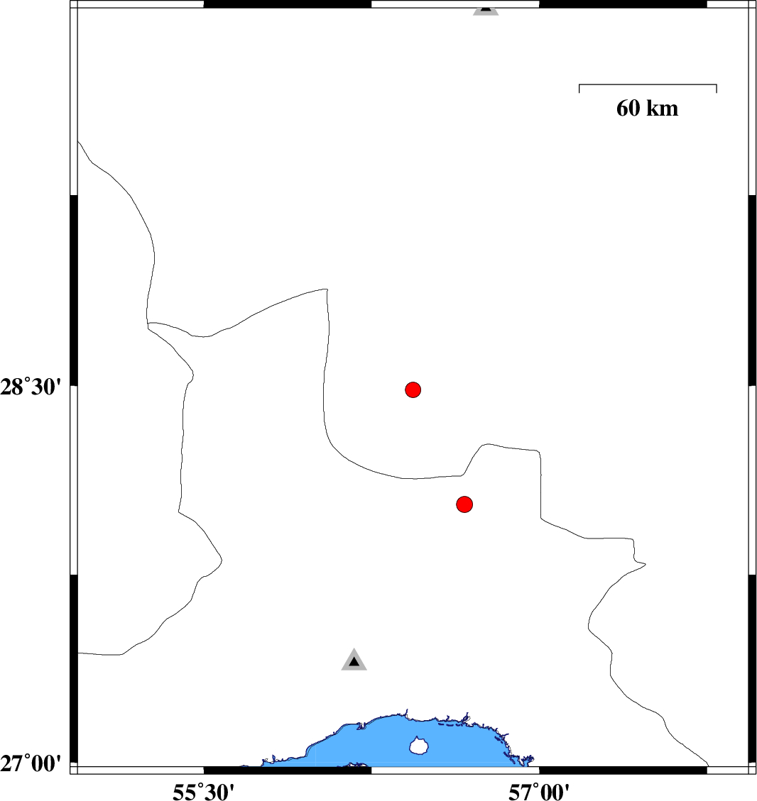 | 2023/07/20 | 04:12:27.3 | 07:42:27.3 | 28.483 | 56.435 | 12 | ML:3.1 | Kerman Province, 56 km North-East of Hajiabad | ||