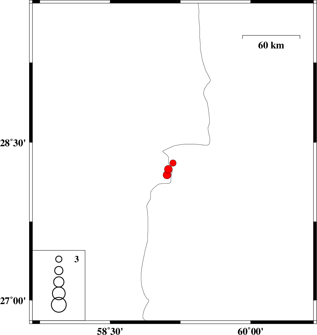 | 2023/07/25 | 02:41:02.5 | 06:11:02.5 | 28.305 | 59.171 | 8 | ML:3.1 | Sistan va Baloochestan Province, 120 km South-East of Bam | ||