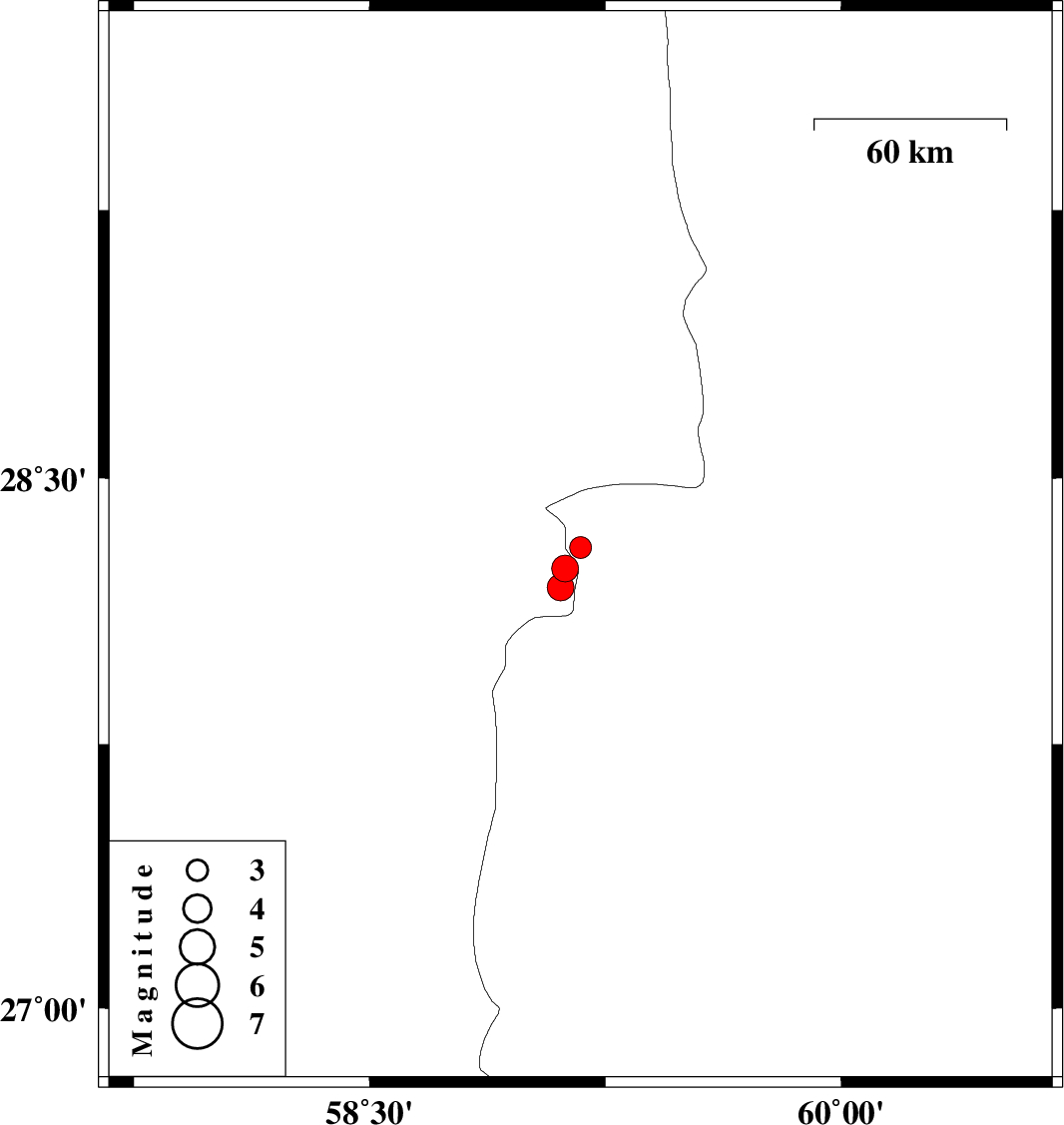 | 2023/07/25 | 01:10:49.8 | 04:40:49.8 | 28.192 | 59.107 | 12 | ML:3.8 | Kerman Province, 141 km North-East of Kahnuj |