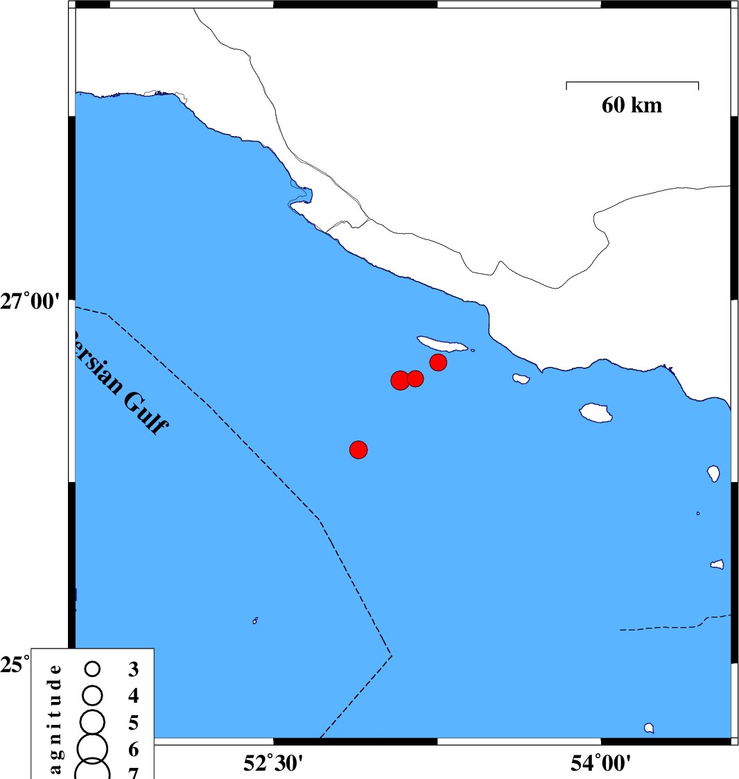 | 2023/07/25 | 10:23:34.1 | 13:53:34.1 | 26.975 | 53.284 | 12 | ML:3.9 | Persian Gulf, 41 km South-East of Lamerd |