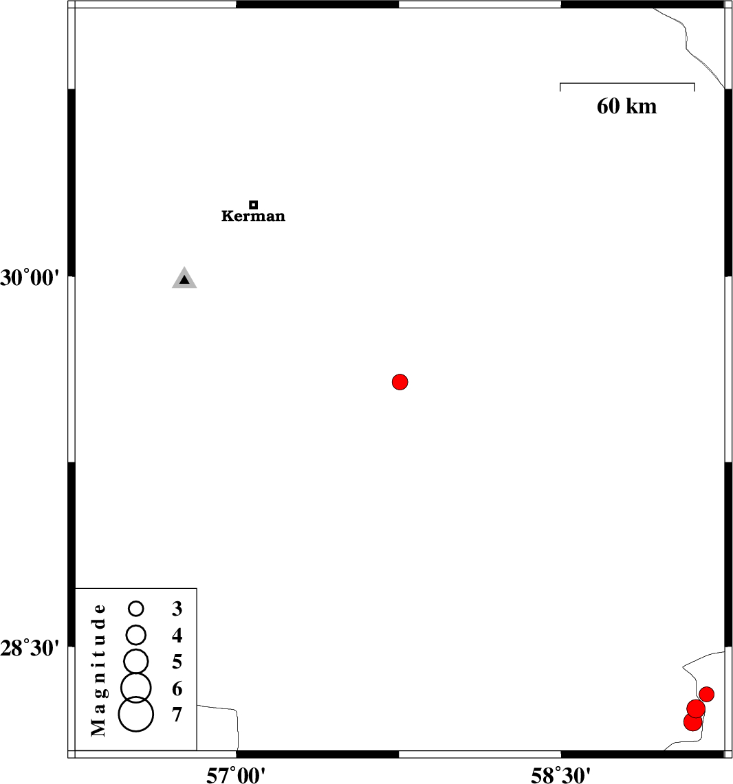 | 2023/07/25 | 02:41:02.5 | 06:11:02.5 | 28.305 | 59.171 | 8 | ML:3.1 | Sistan va Baloochestan Province, 120 km South-East of Bam | ||