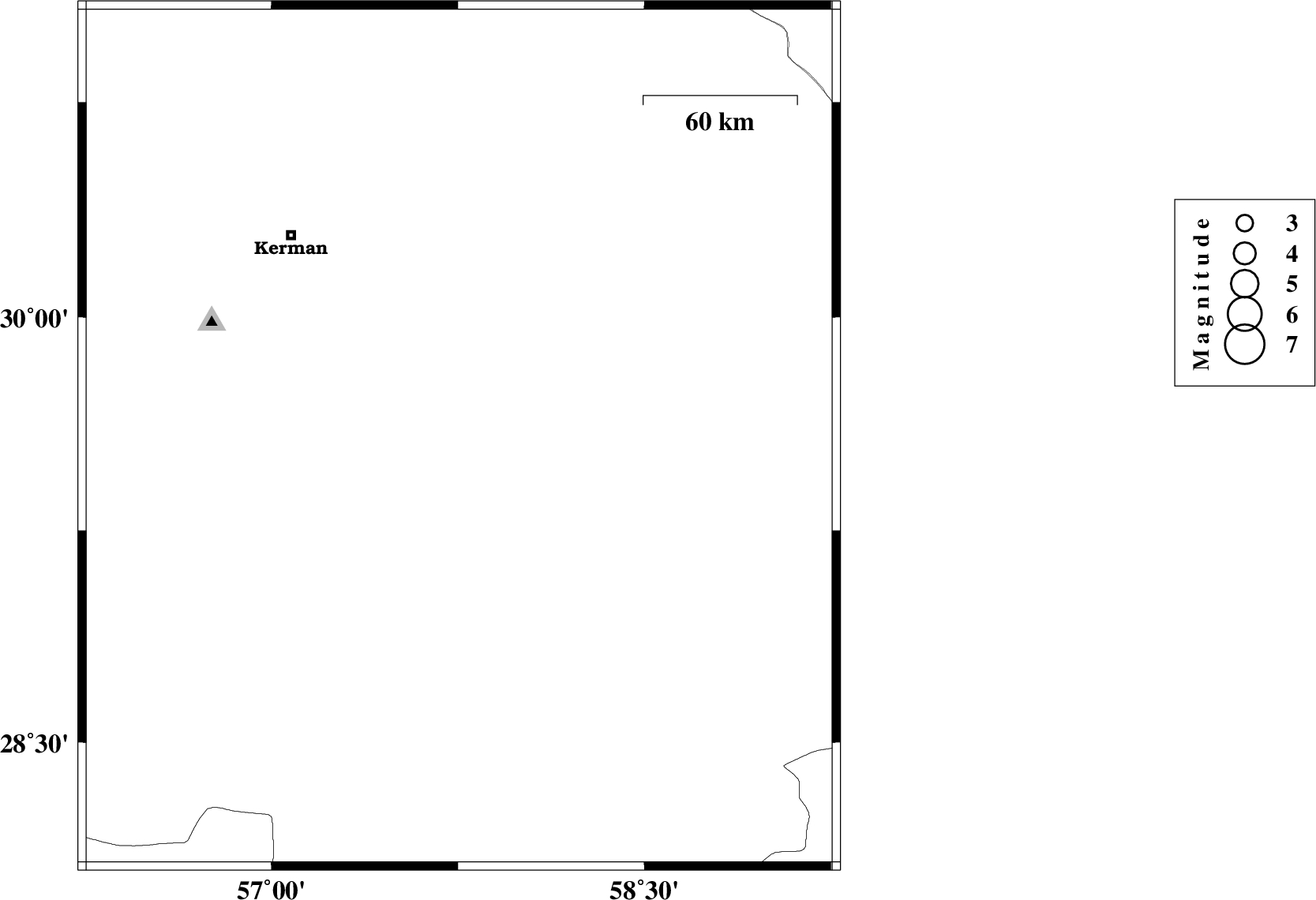 | 2023/07/27 | 16:28:25.0 | 19:58:25.0 | 29.574 | 57.755 | 12 | ML:3.3 | Kerman Province, 101 km North of Jiroft | ||