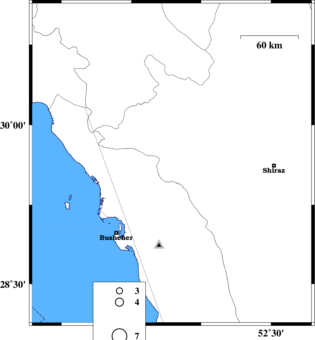 2023/08/02 | 14:52:46.7 | 18:22:46.7 | 29.239 | 50.363 | 12 | ML:3.3 | Persian Gulf, 40 km South-West of Bandar-e genaveh |