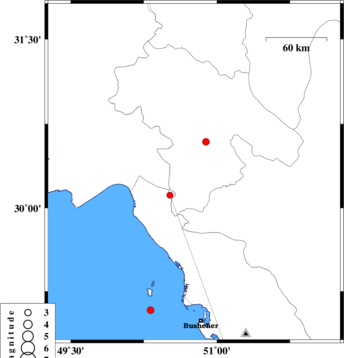 | 2023/07/16 | 12:07:02.7 | 15:37:02.7 | 29.974 | 50.504 | 12 | ML:3 | Khoozestan Province, 44 km North of Bandar-e genaveh |