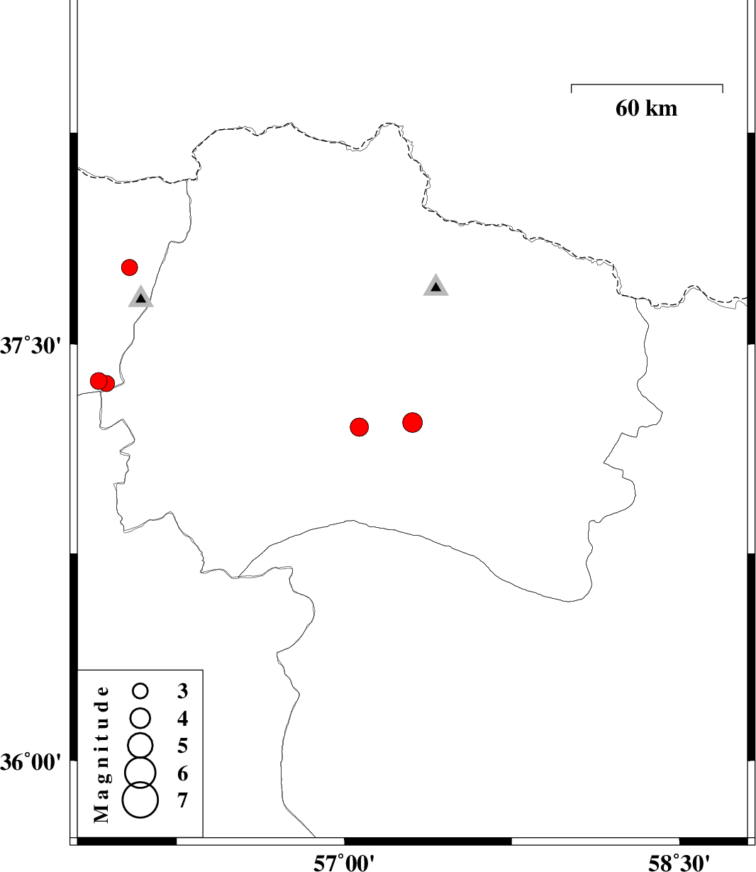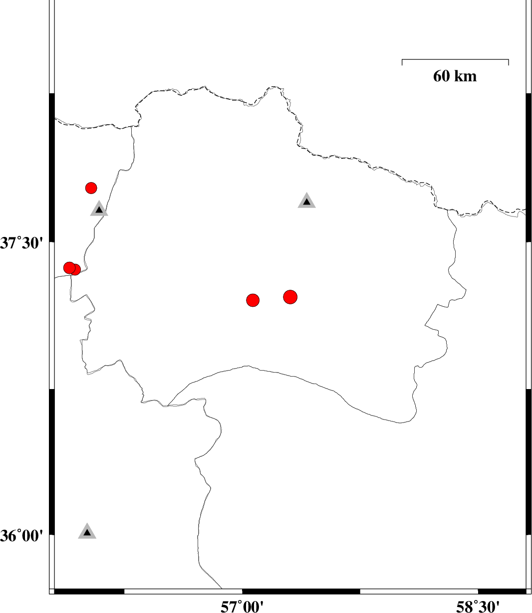 | 2023/07/26 | 20:05:12.6 | 23:35:12.6 | 37.773 | 56.039 | 10 | ML:3.2 | Golestan Province, 65 km North-East of Kalaleh |