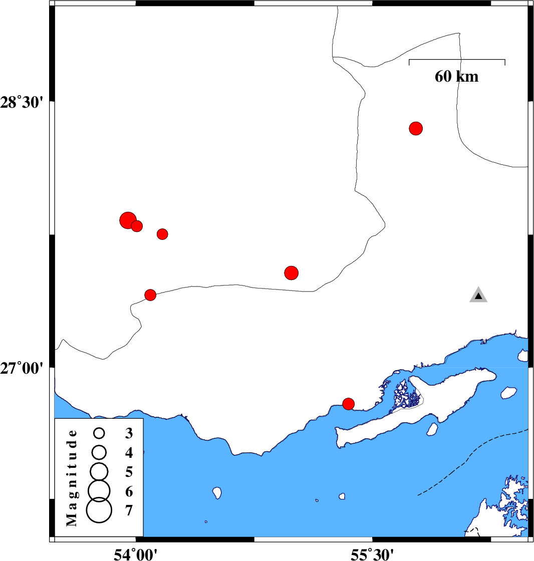 | 2023/08/20 | 08:48:23.2 | 12:18:23.2 | 27.534 | 54.985 | 12 | ML:4 | Fars Province, 66 km South-East of Lar | ||