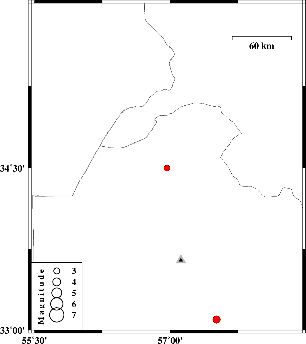 | 2023/08/15 | 05:57:41.6 | 09:27:41.6 | 33.097 | 57.514 | 12 | ML:3.8 | Yazd Province, 78 km South-East of Tabas |