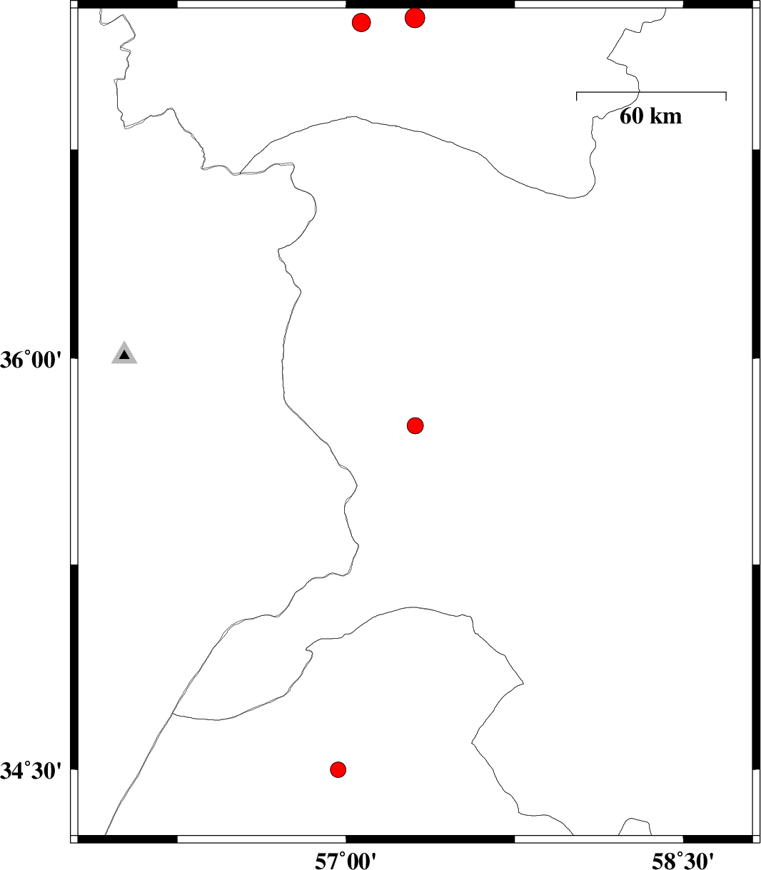 | 2023/08/22 | 06:16:32.4 | 09:46:32.4 | 35.756 | 57.307 | 9 | ML:3.2 | Khorasan(center) Province, 60 km South-West of Sabzevar | ||