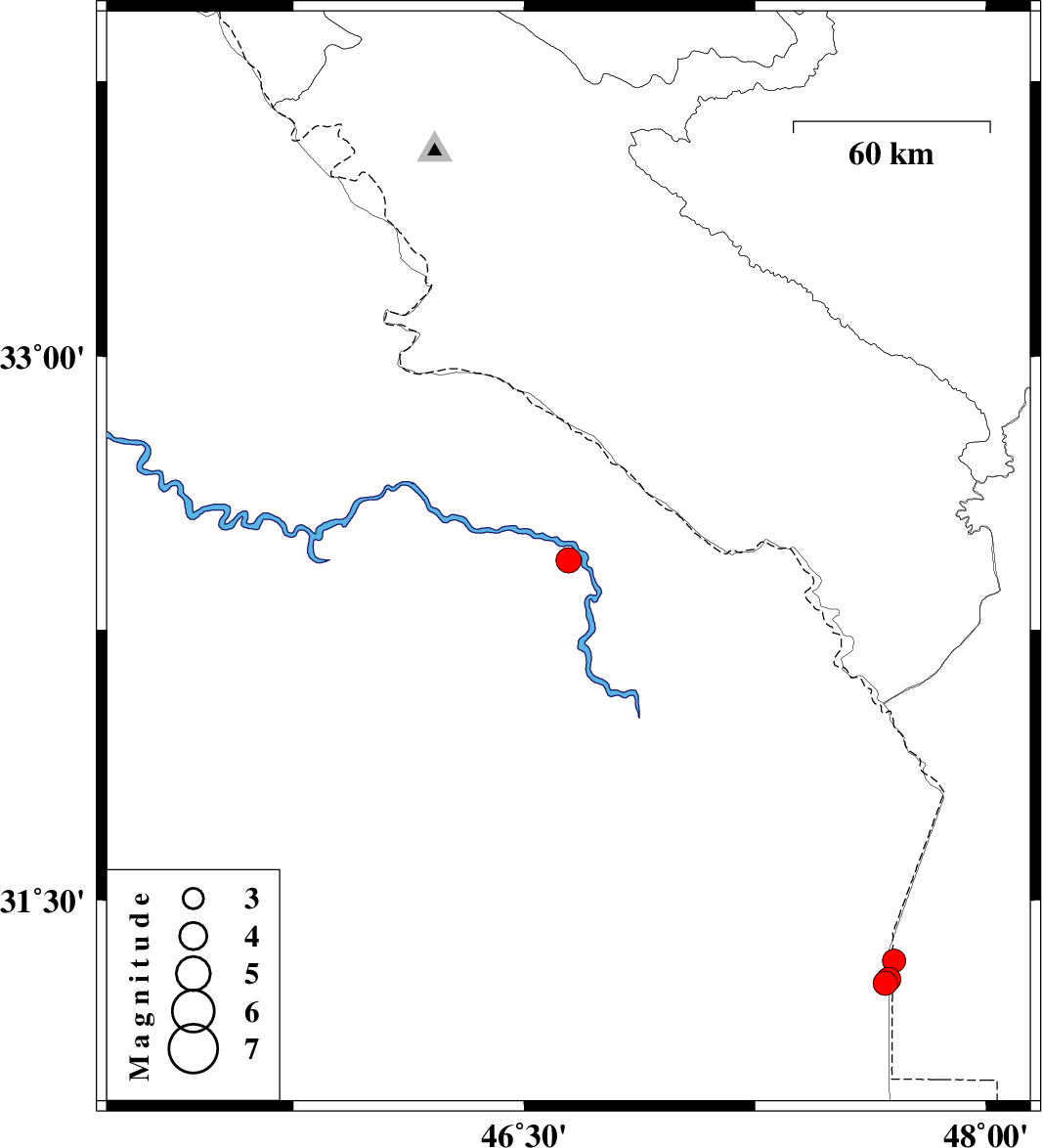 | 2023/08/21 | 01:45:16.4 | 05:15:16.4 | 31.269 | 47.673 | 12 | ML:3.5 | Iraq, 58 km South-West of Susangerd | ||