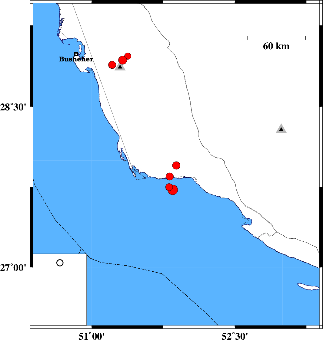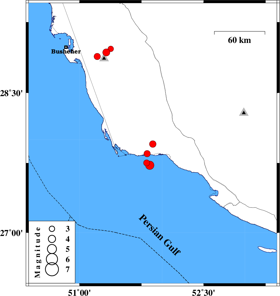 | 2023/09/07 | 14:16:30.5 | 17:46:30.5 | 27.953 | 51.886 | 12 | ML:3.7 | Bushehr Province, 22 km North-West of Bandar-e kangan | ||