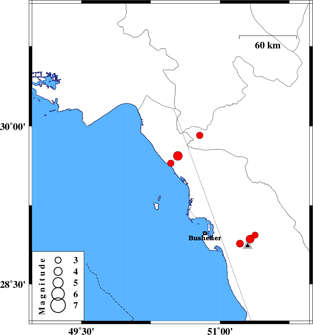 | 2023/09/05 | 07:28:06.2 | 10:58:06.2 | 29.719 | 50.543 | 15 | ML:4.4 | Bushehr Province, 16 km North of Bandar-e genaveh |