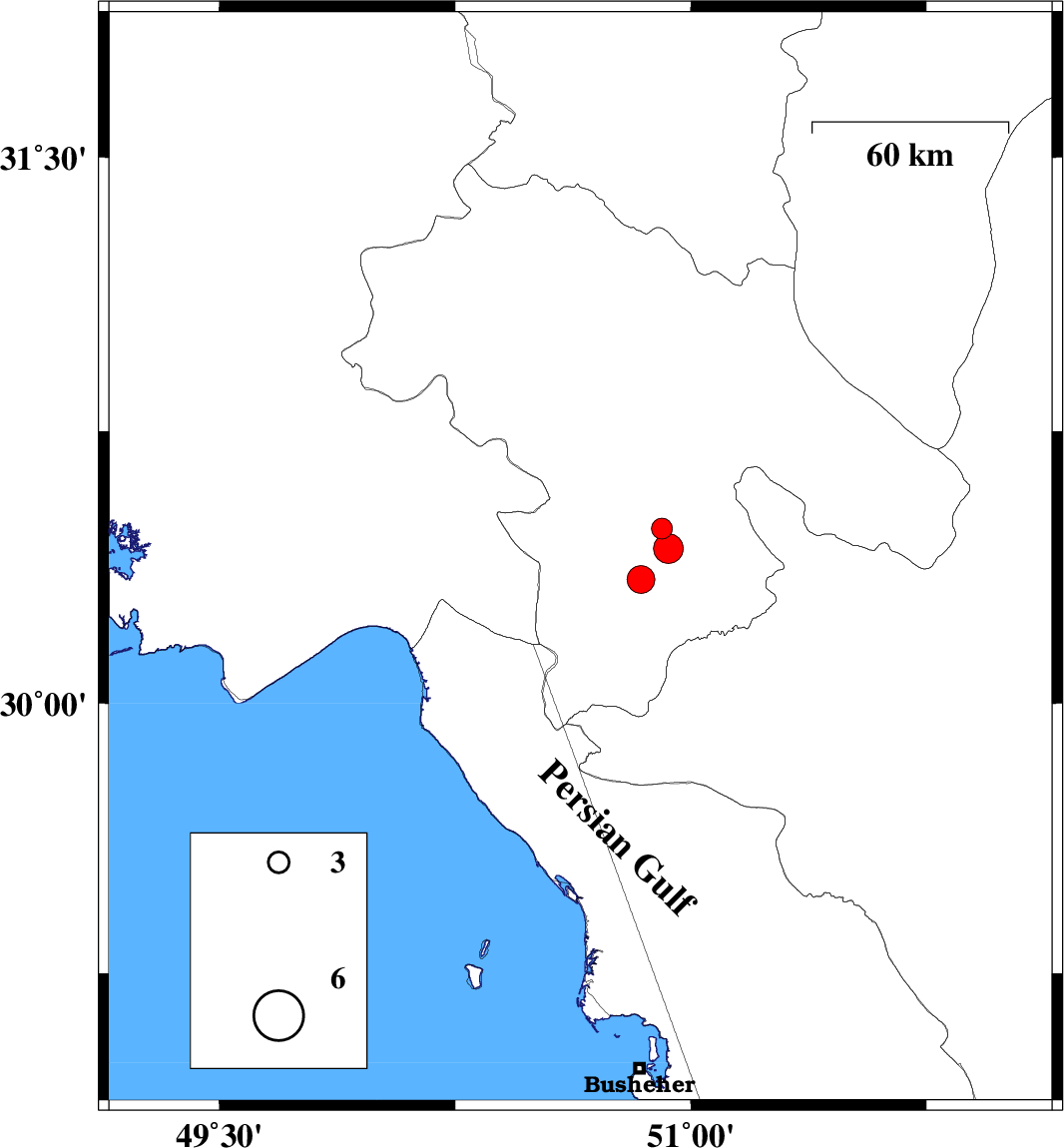 2023/09/21 | 04:02:36.4 | 07:32:36.4 | 30.342 | 50.67 | 12 | ML:4.3 | Kohkiluieh va boyerahmad Province, 11 km -West of Dogonbadan | ||