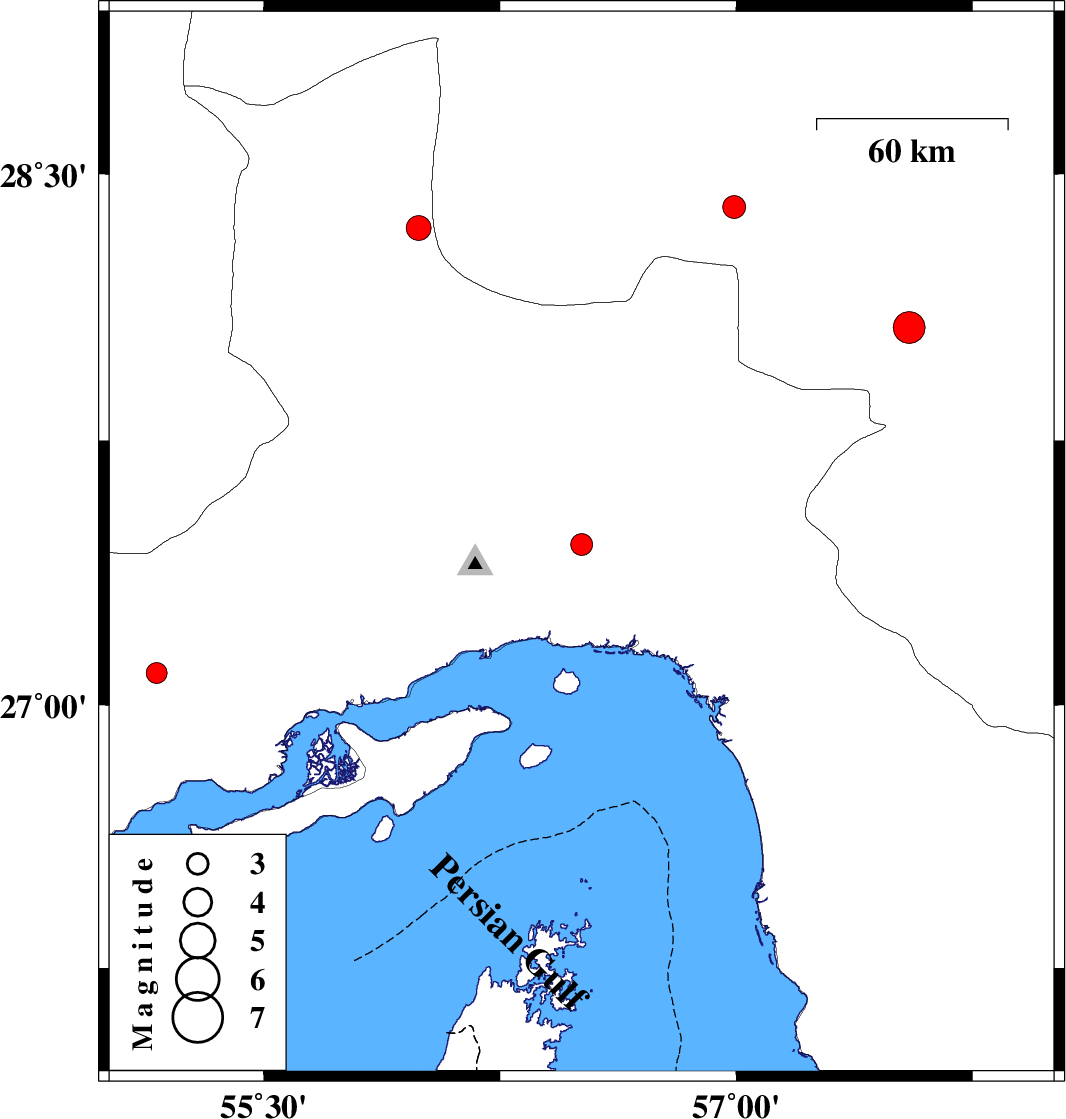 | 2023/09/02 | 14:30:37.9 | 18:00:37.9 | 28.069 | 57.549 | 19 | ML:4.5 | Kerman Province, 19 km North-West of Kahnuj |