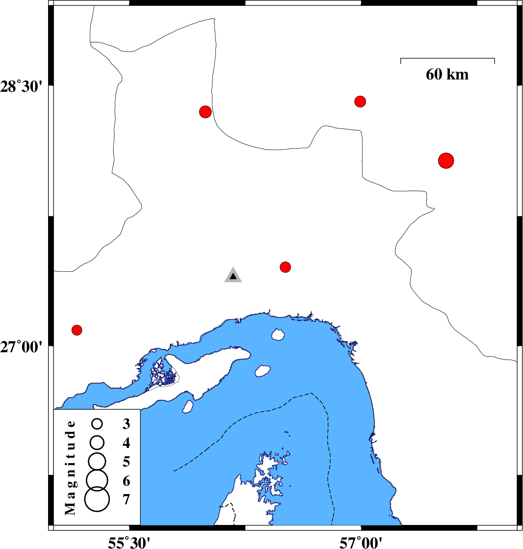 | 2023/09/25 | 02:04:23.5 | 05:34:23.5 | 27.091 | 55.16 | 12 | ML:3 | Hormozgan Province, 70 km North-East of Bandar-e lengeh | ||