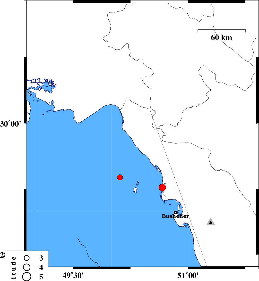 | 2023/09/28 | 08:52:36.7 | 12:22:36.7 | 29.747 | 50.945 | 12 | ML:4.1 | Bushehr Province, 46 km North-East of Bandar-e genaveh |