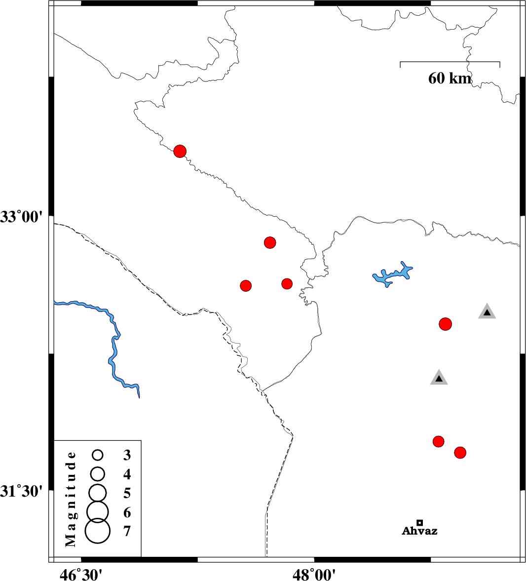 | 2023/10/11 | 06:48:37.1 | 10:18:37.1 | 31.707 | 48.938 | 12 | ML:3.4 | Khoozestan Province, 38 km South of Shushtar | ||