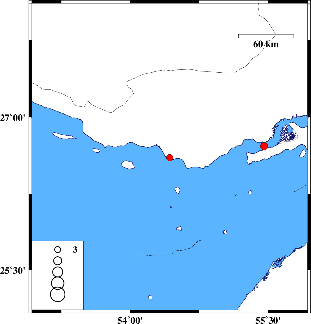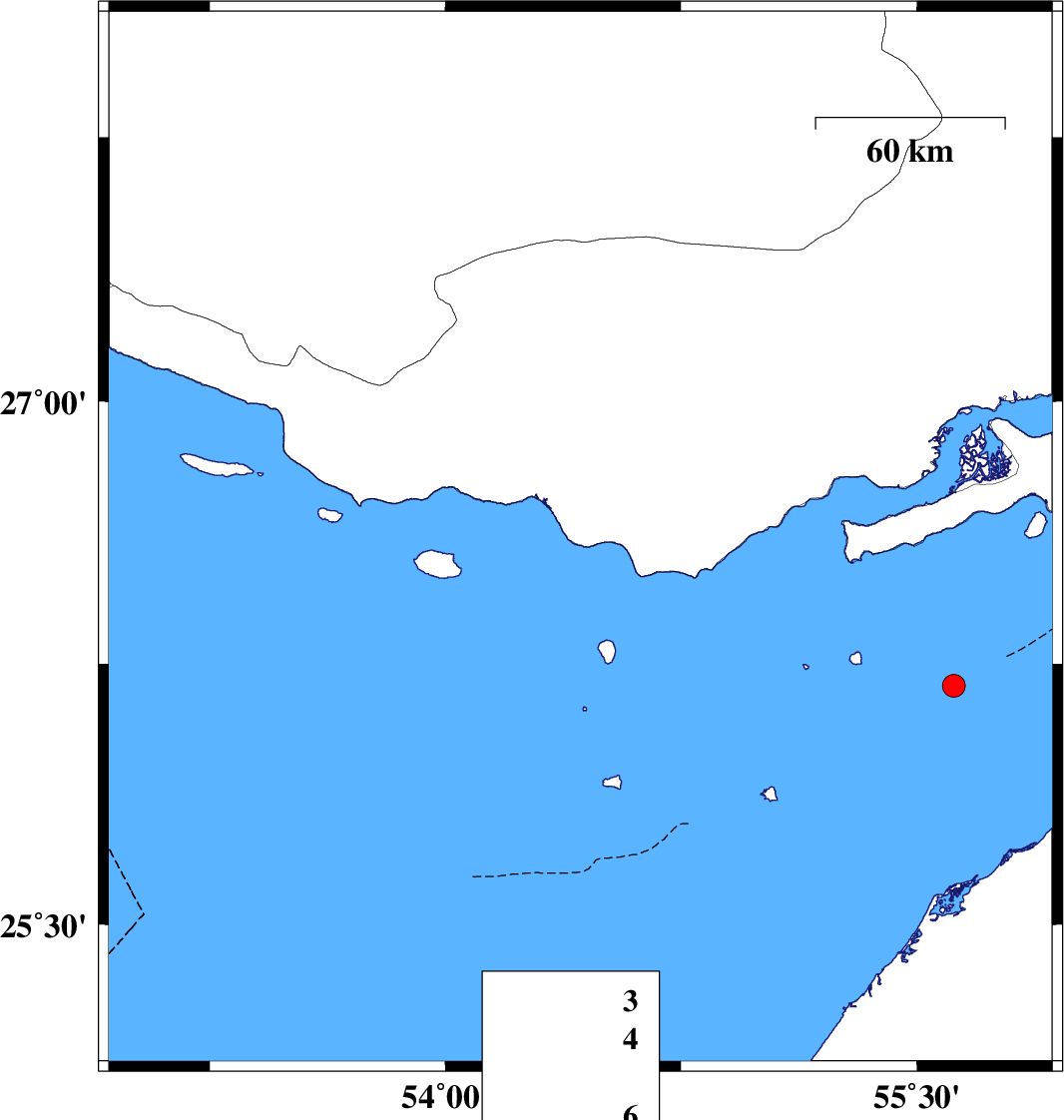 | 2023/10/23 | 10:58:23.8 | 14:28:23.8 | 26.717 | 55.458 | 25 | ML:3.6 | Persian Gulf, 64 km North-East of Bandar-e lengeh |