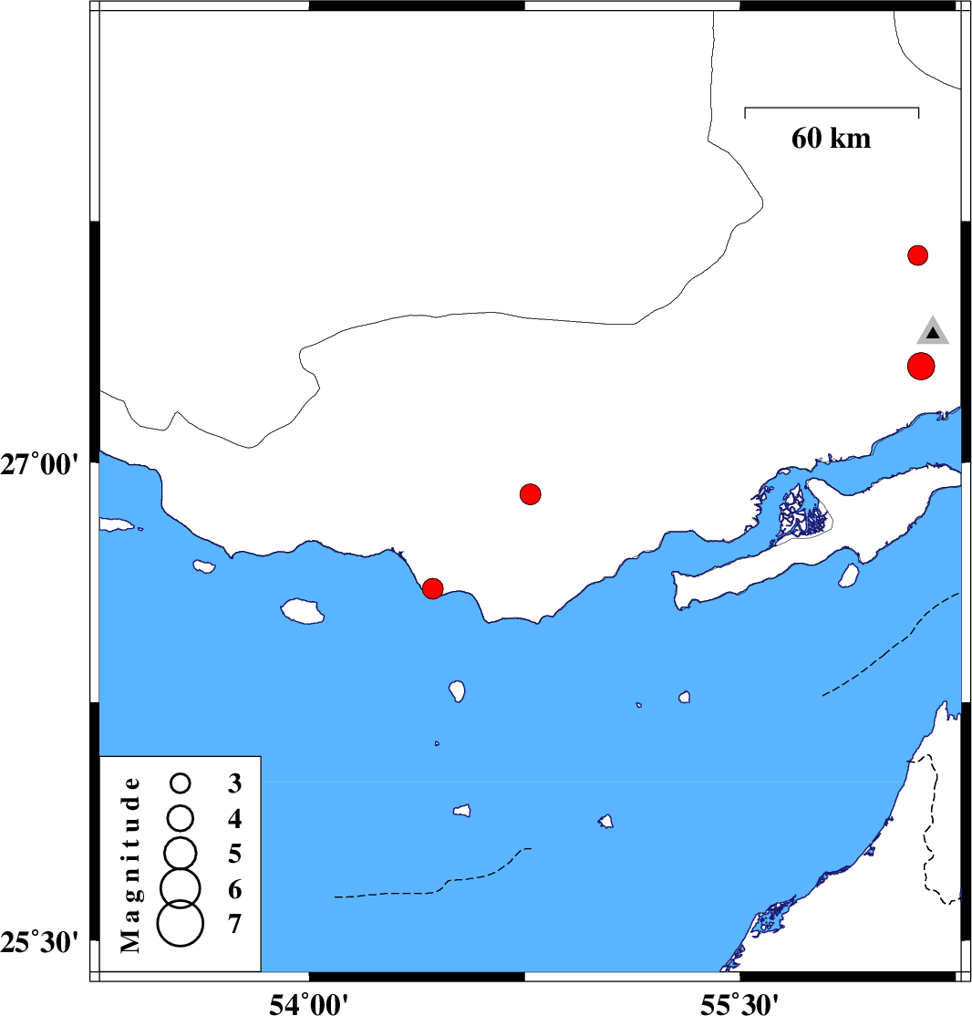 | 2023/10/25 | 06:04:36.1 | 09:34:36.1 | 26.606 | 54.43 | 12 | ML:3.3 | Hormozgan Province, 43 km -West of Bandar-e lengeh | ||