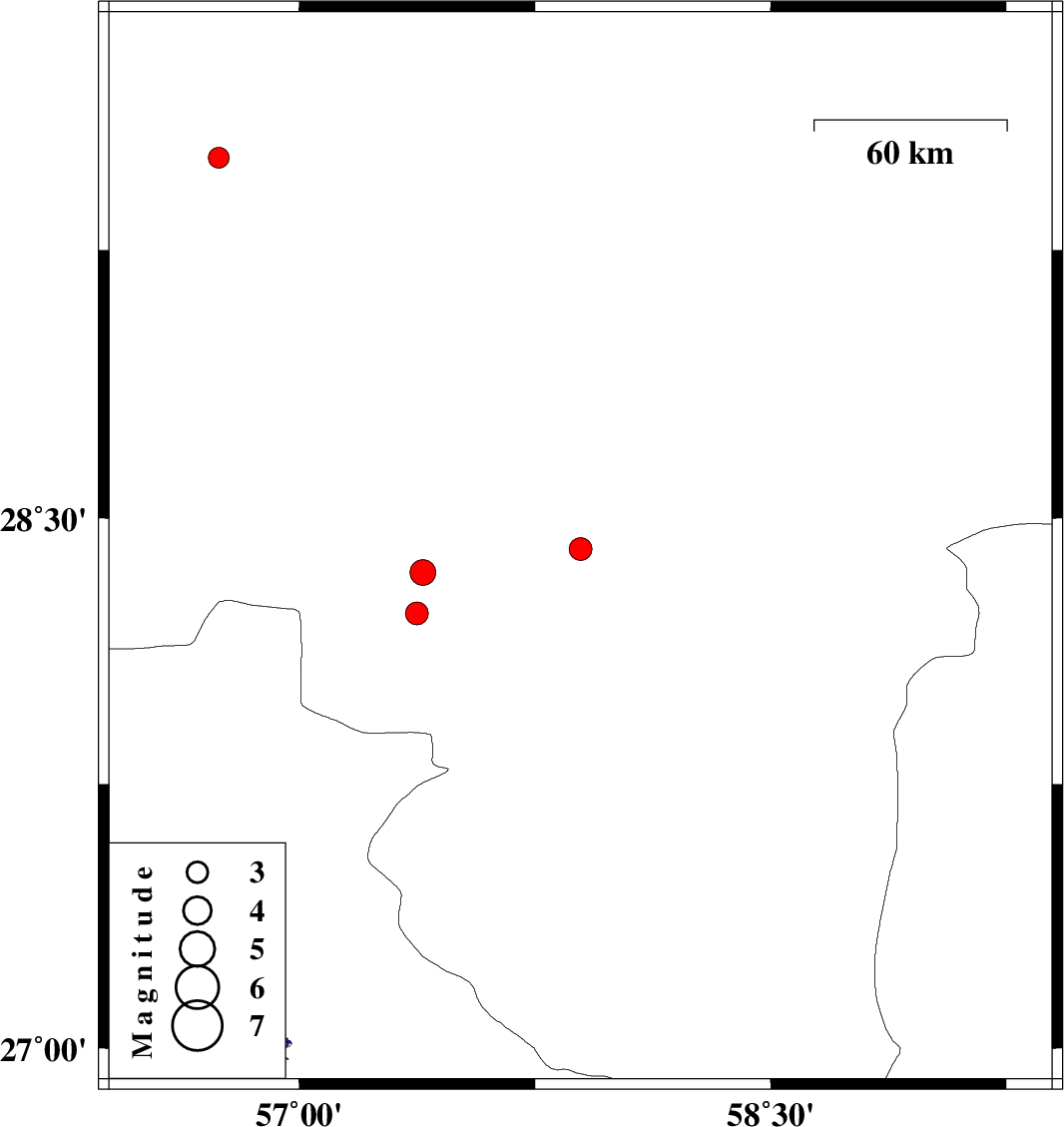 | 2023/10/30 | 16:09:30.1 | 19:39:30.1 | 28.346 | 57.394 | 12 | ML:3.7 | Kerman Province, 49 km South-West of Jiroft | ||