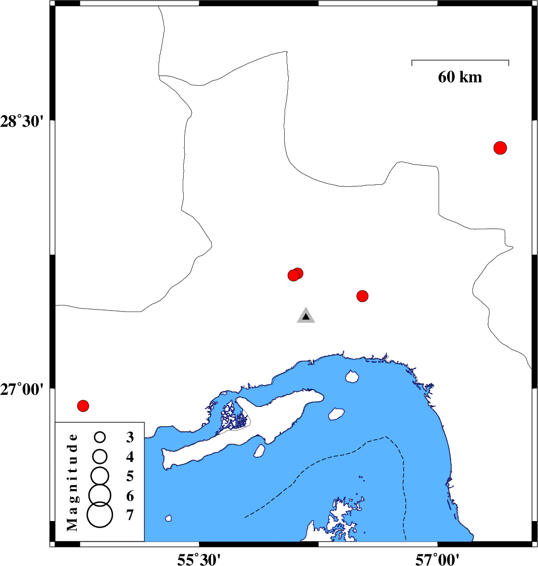 | 2023/10/31 | 08:15:59.6 | 11:45:59.6 | 27.519 | 56.526 | 12 | ML:3.3 | Hormozgan Province, 44 km North-East of Bandar-e abbas | ||