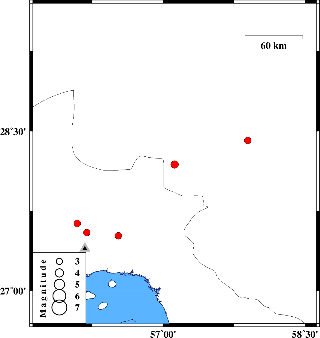 | 2023/10/31 | 08:15:59.6 | 11:45:59.6 | 27.519 | 56.526 | 12 | ML:3.3 | Hormozgan Province, 44 km North-East of Bandar-e abbas |