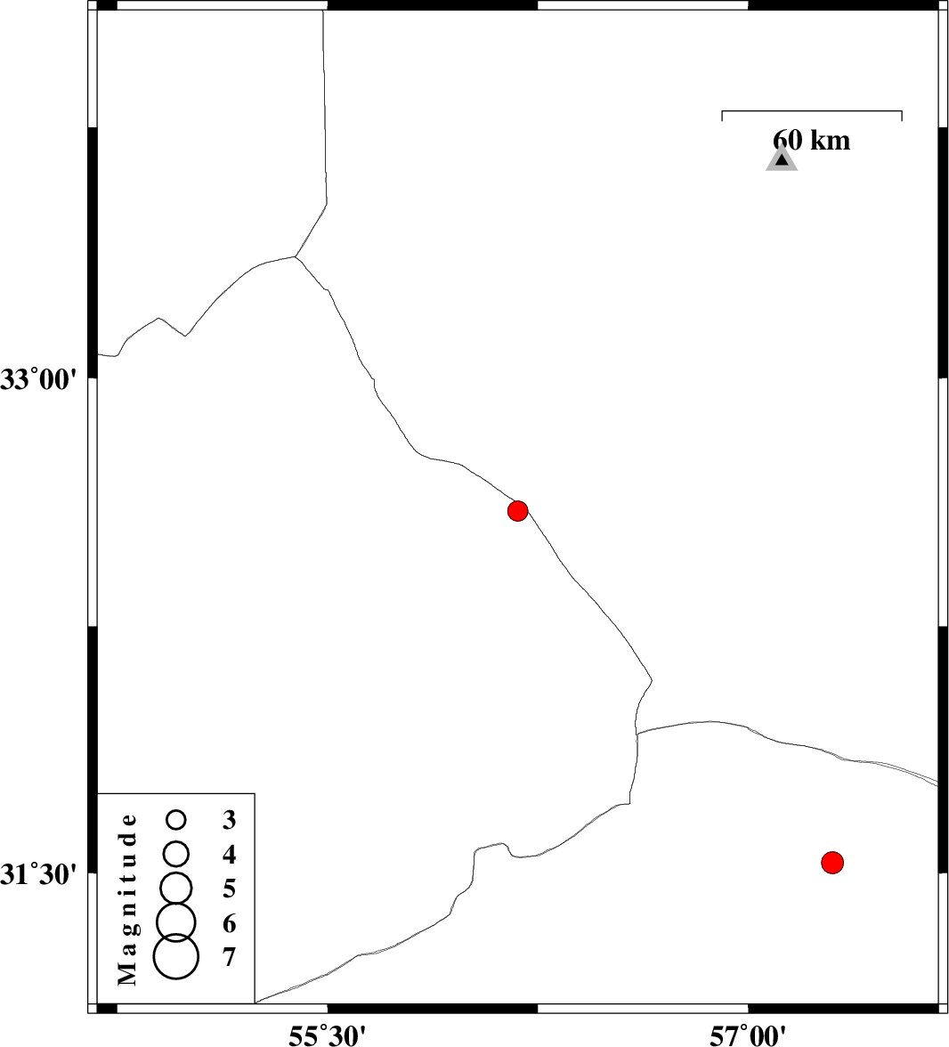 | 2023/11/08 | 10:35:52.6 | 14:05:52.6 | 32.599 | 56.178 | 12 | ML:3.3 | Yazd Province, 131 km South-West of Tabas | ||