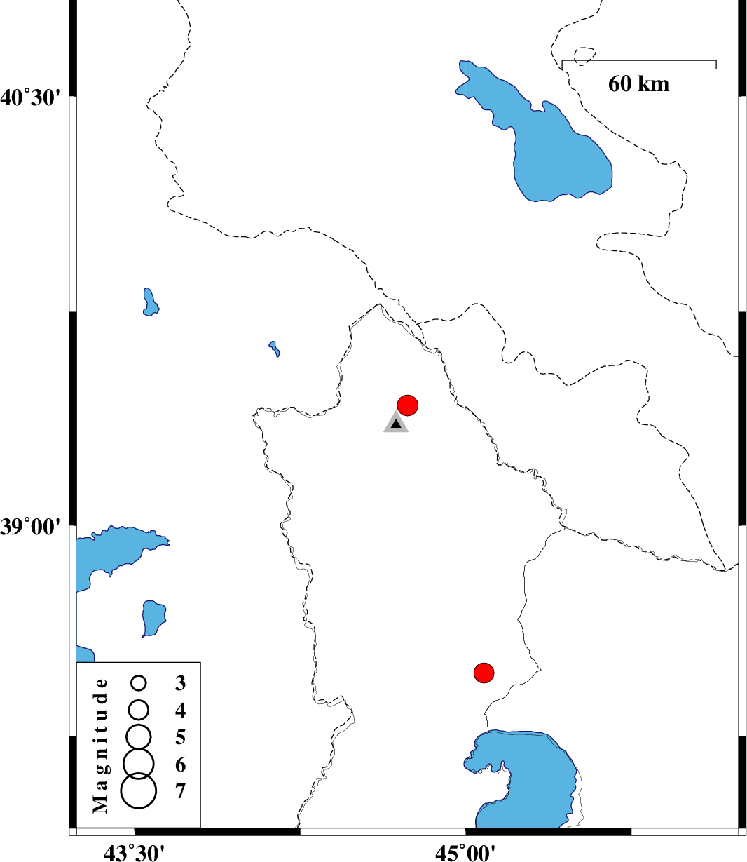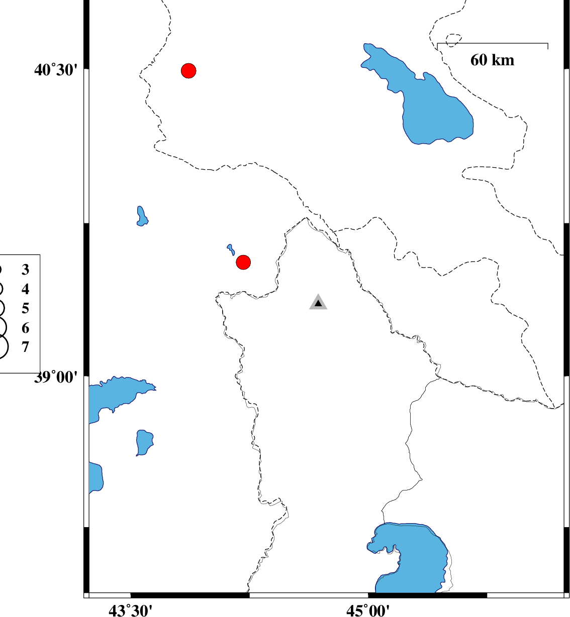 | 2023/11/13 | 14:58:05.9 | 18:28:05.9 | 39.423 | 44.736 | 10 | ML:4.3 | Azarbaijan Gharbi Province, 25 km North-East of Maku | ||