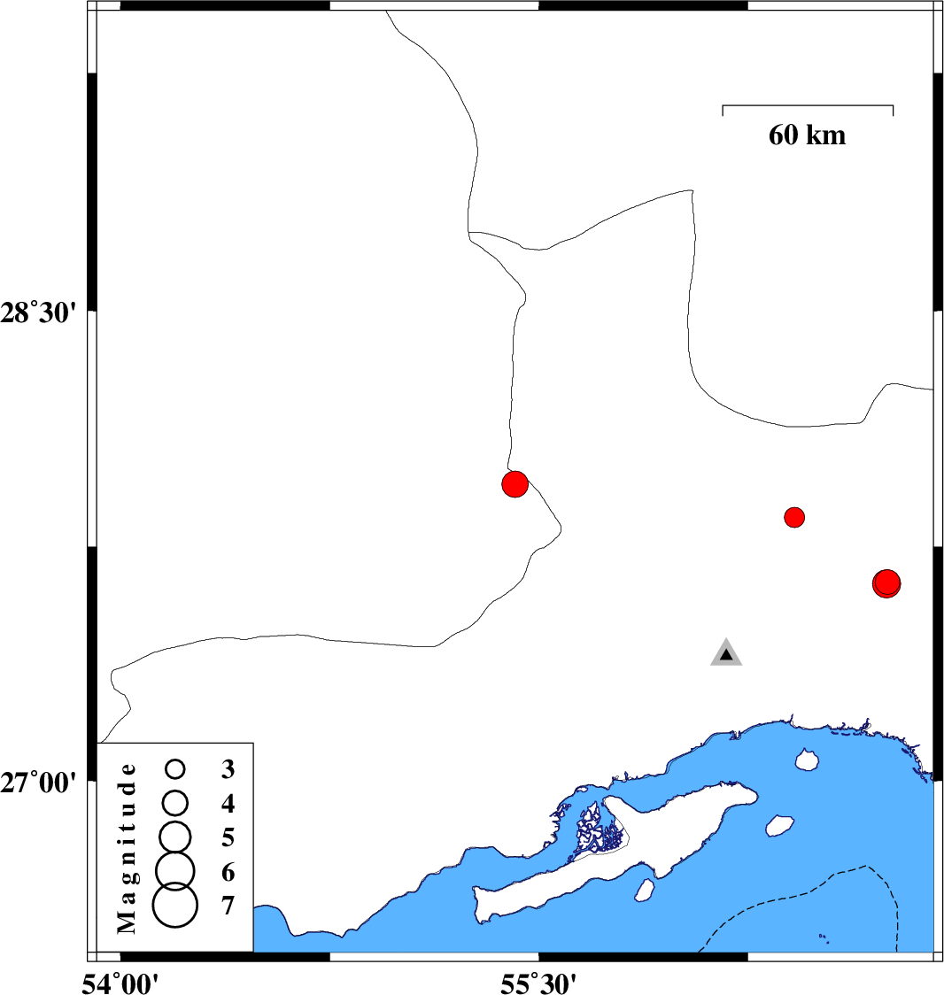 | 2023/11/20 | 15:37:57.8 | 19:07:57.8 | 27.631 | 56.746 | 12 | ML:4.5 | Hormozgan Province, 54 km North-West of Dehbarez |