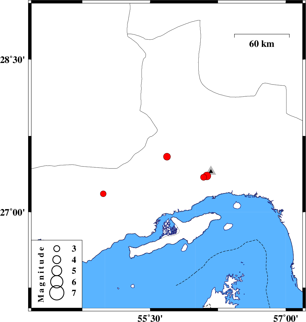 | 2021/03/20 | 00:36:08.3 | 04:06:08.3 | 27.357 | 56.127 | 6 | ML:3.9 | Hormozgan Province, 25 km North-West of Bandar-e abbas |