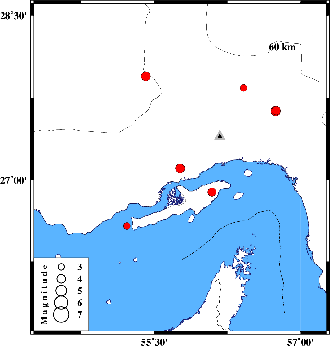 | 2023/11/25 | 18:08:35.6 | 21:38:35.6 | 26.89 | 56.091 | 12 | ML:3.9 | Persian Gulf, 19 km -West of Qeshm | ||