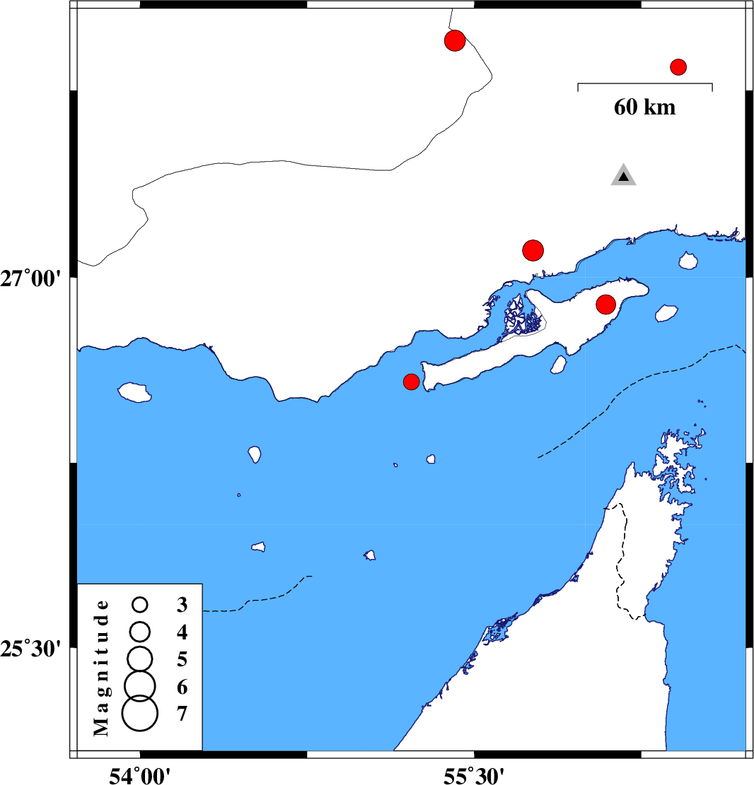 | 2023/11/25 | 18:08:35.6 | 21:38:35.6 | 26.89 | 56.091 | 12 | ML:3.9 | Persian Gulf, 19 km -West of Qeshm | ||