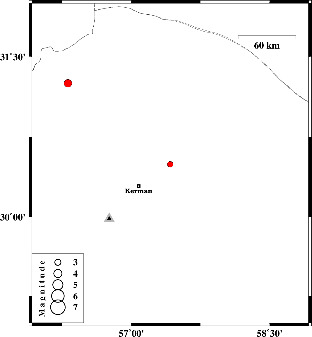 | 2023/11/22 | 02:11:43.2 | 05:41:43.2 | 31.25 | 56.312 | 12 | ML:3.8 | Kerman Province, 48 km -West of Ravar |