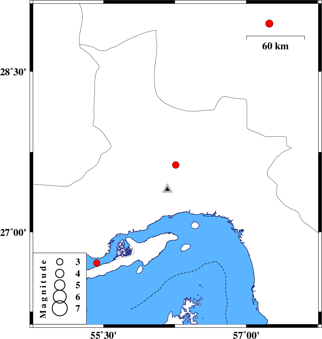 | 2024/01/04 | 19:09:03.7 | 22:39:03.7 | 26.709 | 55.428 | 12 | ML:3.1 | Persian Gulf, 61 km North-East of Bandar-e lengeh | ||