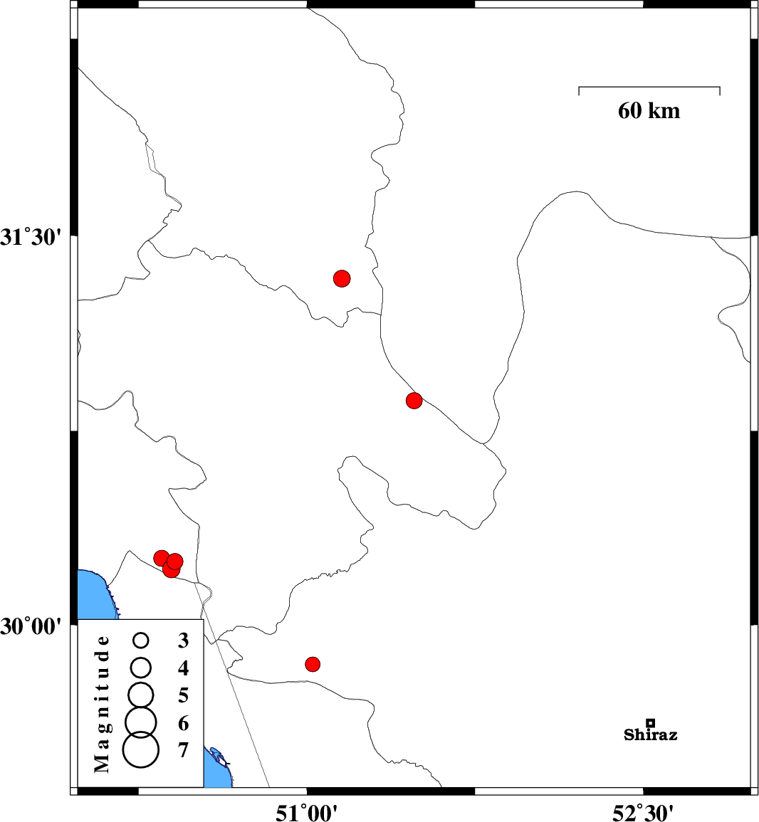 | 2021/03/11 | 11:13:54.2 | 14:43:54.2 | 29.847 | 51.025 | 12 | ML:3 | Fars Province, 61 km South-East of Dogonbadan | ||