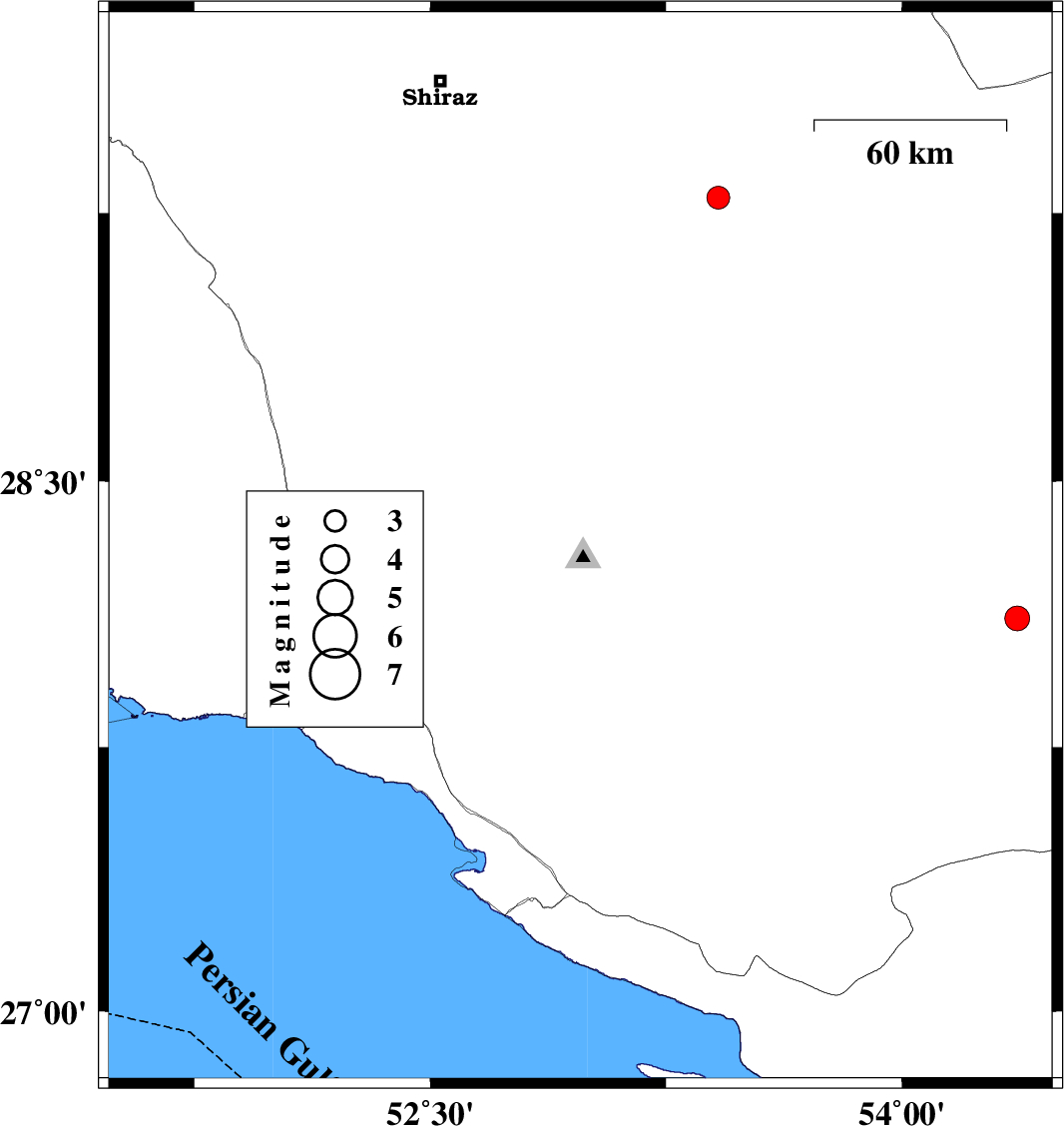 | 2021/03/18 | 03:33:00.5 | 07:03:00.5 | 28.311 | 52.978 | 12 | ML:3.2 | Fars Province, 18 km South of Qir va Karzin | ||