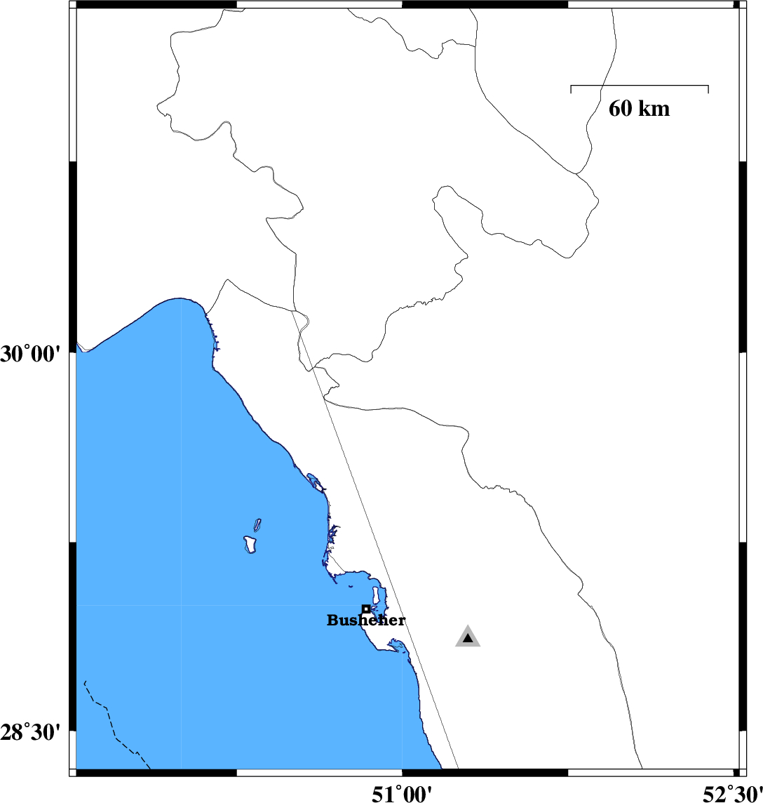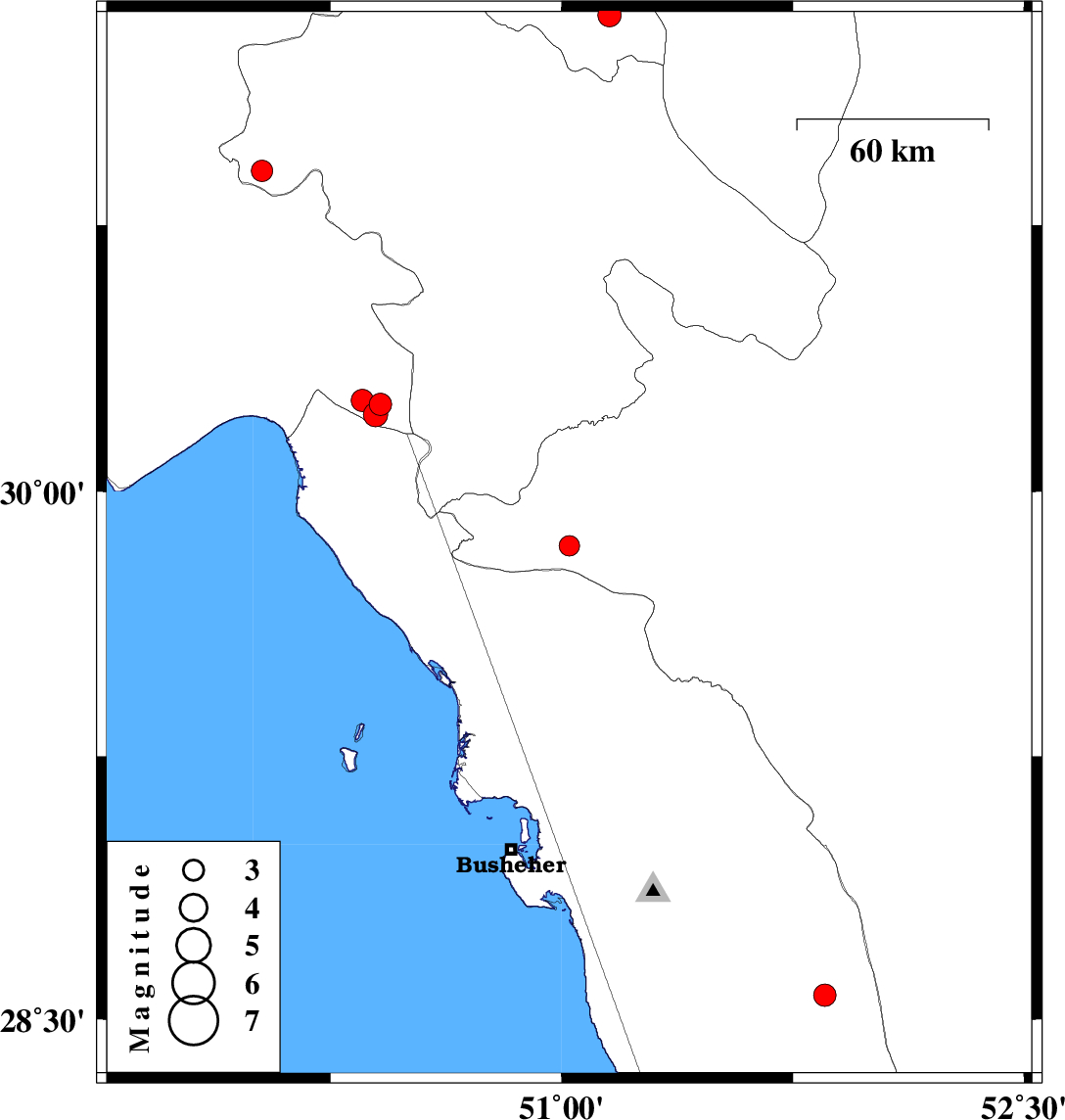 | 2021/03/08 | 14:11:38.0 | 17:41:38.0 | 28.569 | 51.854 | 12 | ML:3.3 | Bushehr Province, 40 km South-West of Farashband | ||