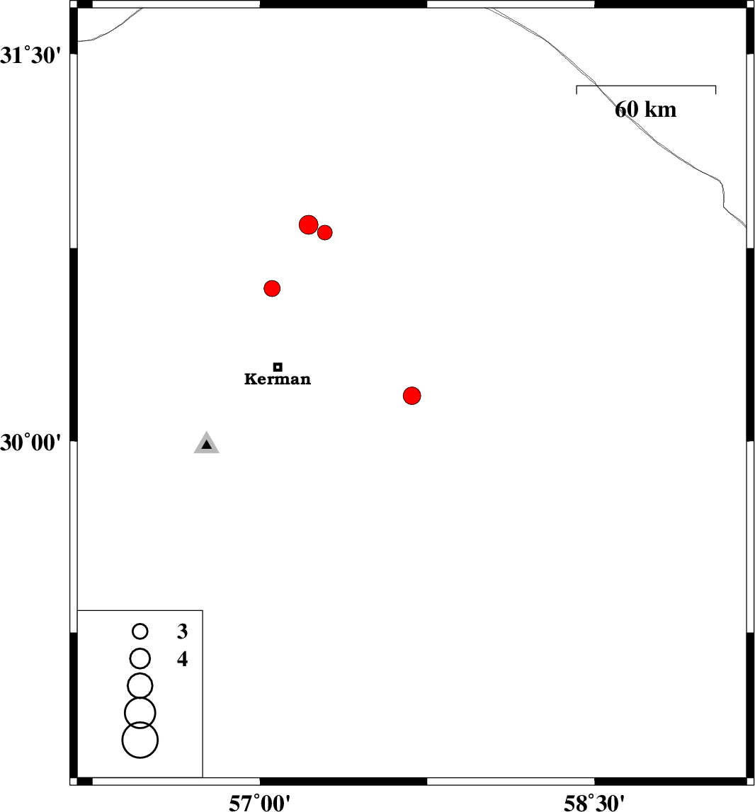 | 2021/02/27 | 02:37:13.0 | 06:07:13.0 | 30.594 | 57.054 | 12 | ML:3.2 | Kerman Province, 34 km North of Kerman | ||