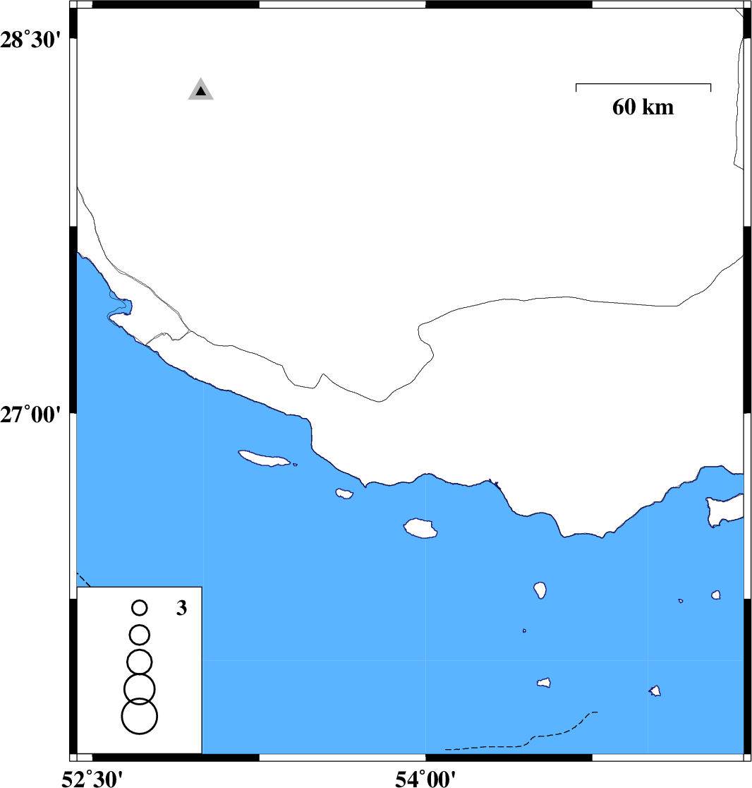 2021/03/11 | 07:51:54.2 | 11:21:54.2 | 27.12 | 53.93 | 12 | ML:3.5 | Hormozgan Province, 44 km -West of Bastak |
