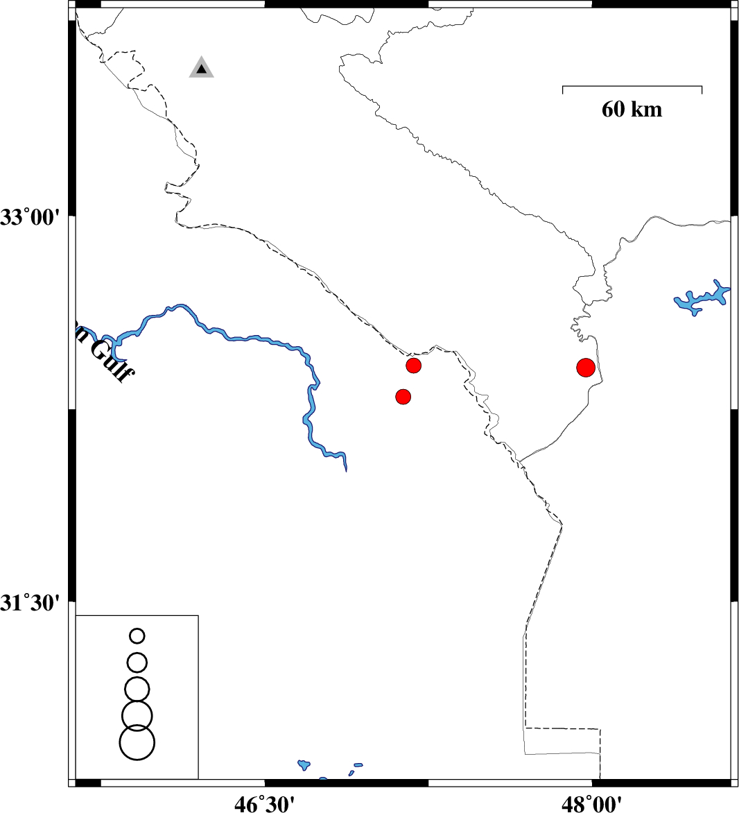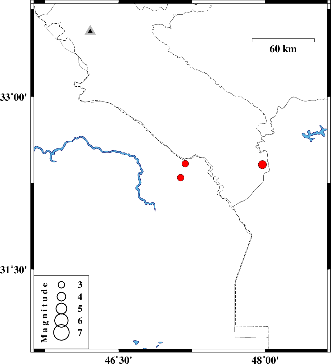 | 2021/03/08 | 03:24:19.0 | 06:54:19.0 | 32.42 | 47.182 | 19 | ML:3.1 | Iraq, 31 km South of Dehloran | ||