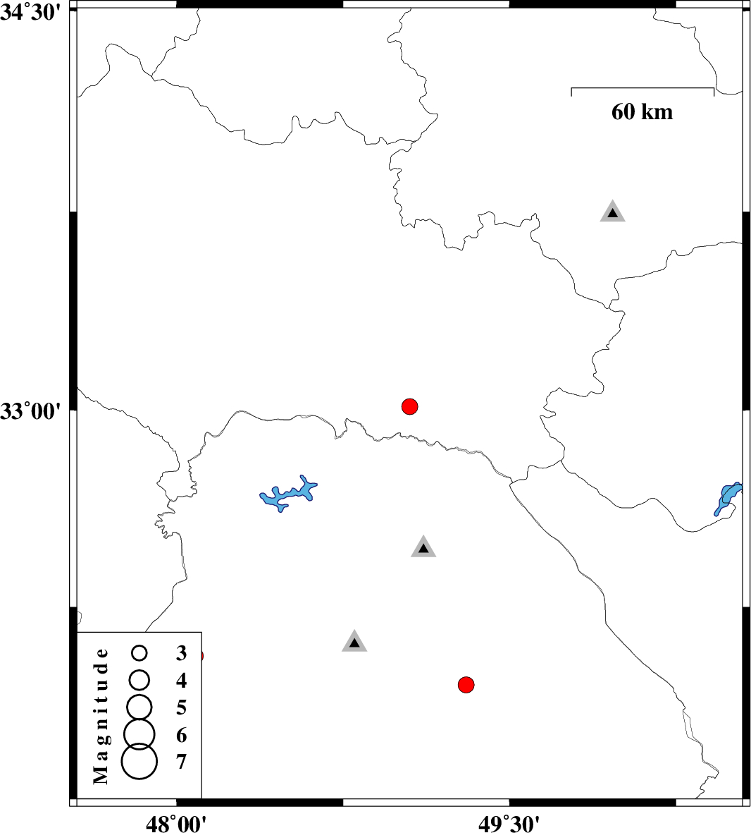 | 2024/01/27 | 21:58:09.7 | 01:28:09.7 | 33.013 | 49.05 | 12 | ML:3.3 | Lorestan Province, 52 km South of Dorud | ||