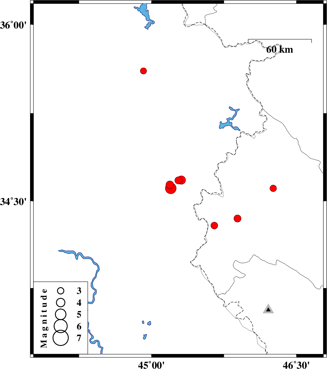 | 2021/01/29 | 14:03:22.2 | 17:33:22.2 | 34.29 | 45.65 | 10 | ML:3.3 | Kermanshah Province, 26 km South of Qasr-E-Shirin | ||