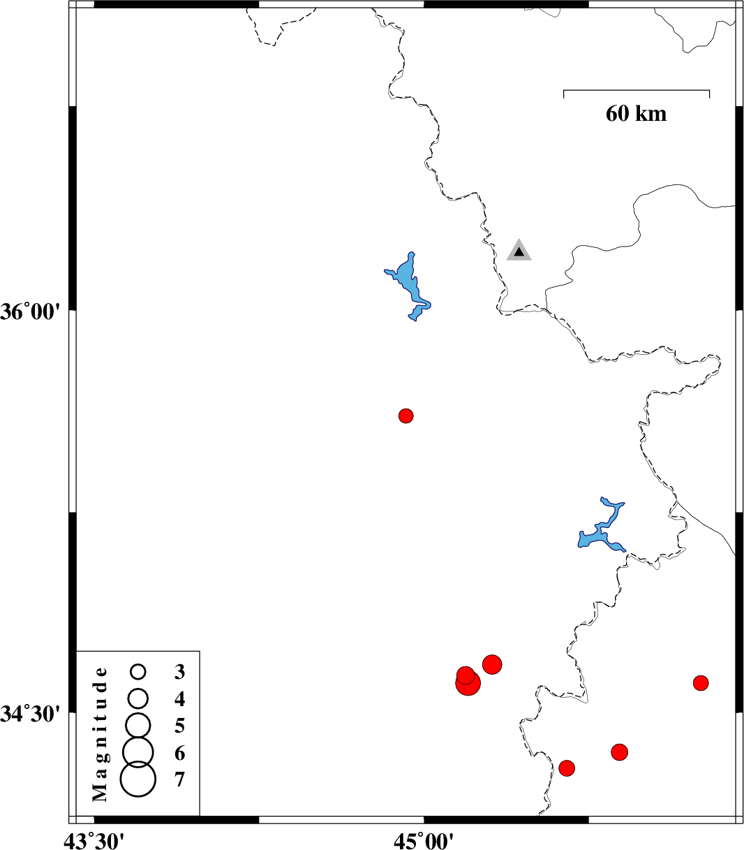| 2021/01/29 | 14:03:22.2 | 17:33:22.2 | 34.29 | 45.65 | 10 | ML:3.3 | Kermanshah Province, 26 km South of Qasr-E-Shirin | ||