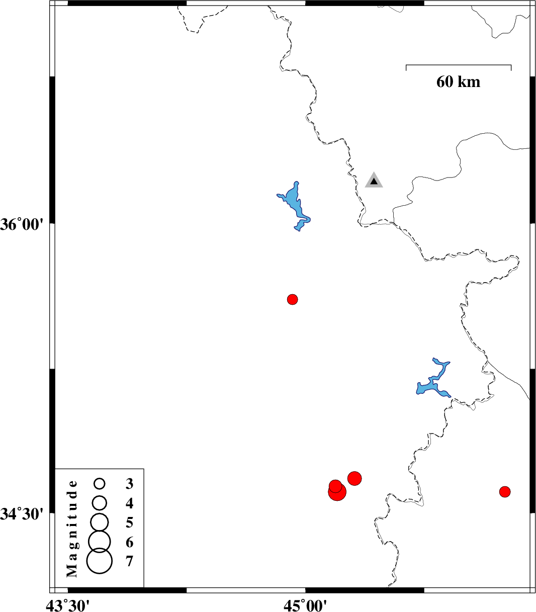 | 2021/02/12 | 05:28:29.7 | 08:58:29.7 | 34.68 | 45.31 | 25 | ML:4 | Iraq, 31 km North-West of Qasr-E-Shirin | ||