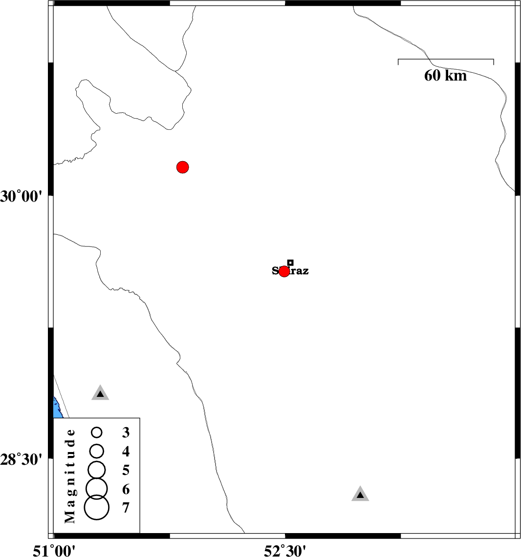 | 2024/01/31 | 03:29:54.8 | 06:59:54.8 | 29.569 | 52.493 | 8 | ML:3.3 | Fars Province, 7 km of Shiraz |
