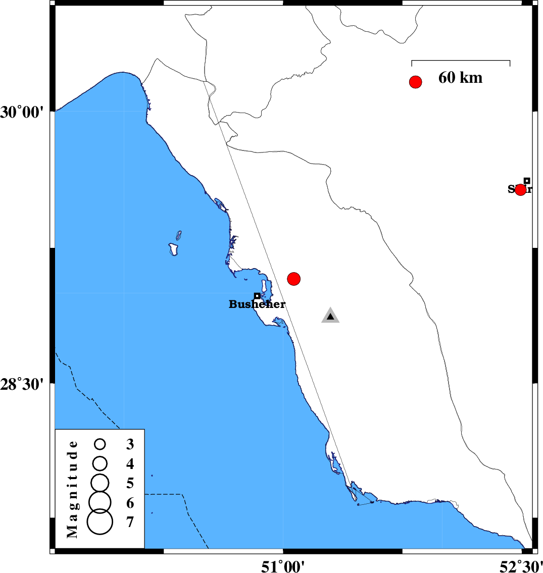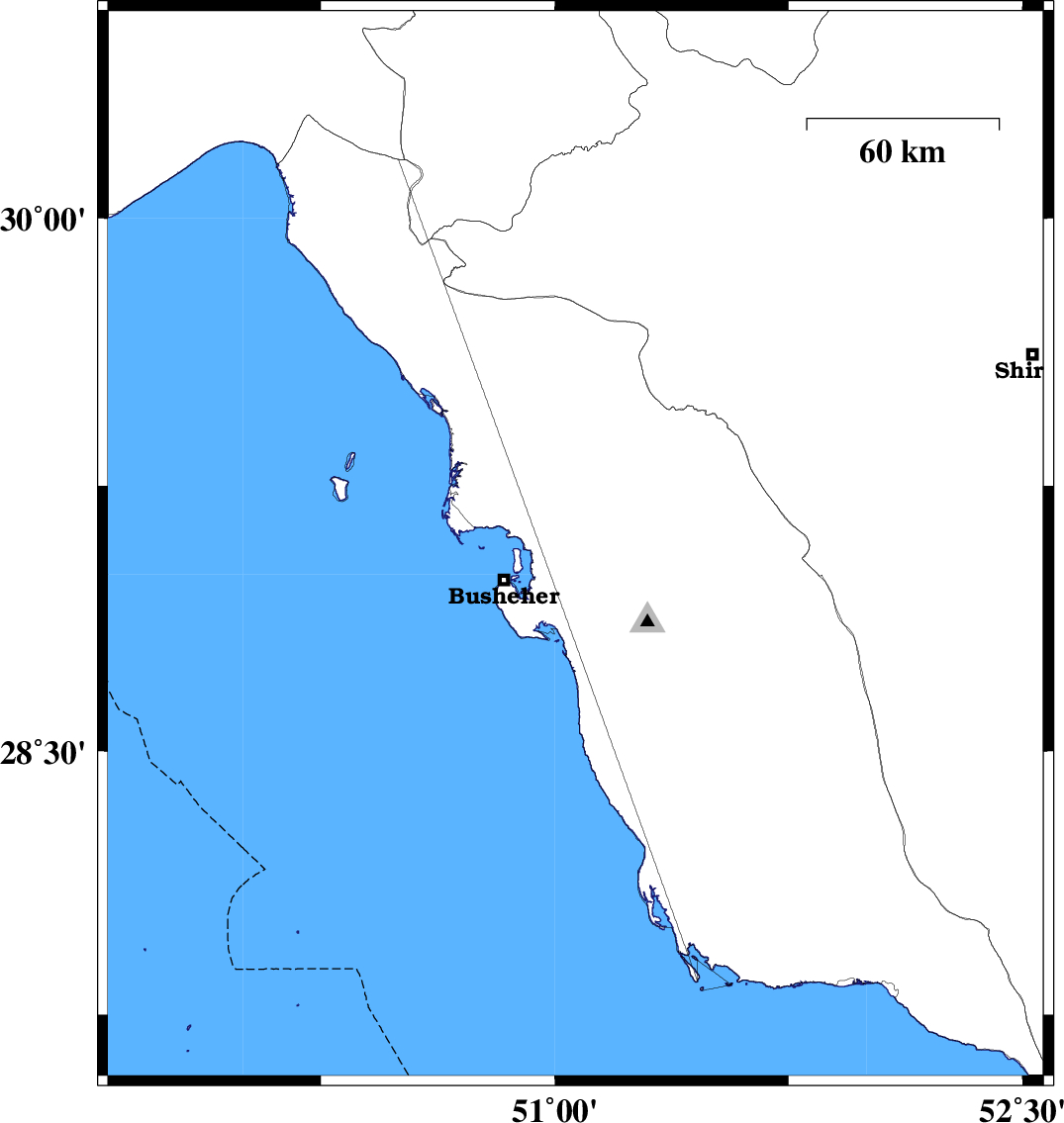 | 2024/02/07 | 01:25:31.8 | 04:55:31.8 | 29.078 | 51.067 | 16 | ML:3.6 | Bushehr Province, 25 km South-West of Borazjan | ||