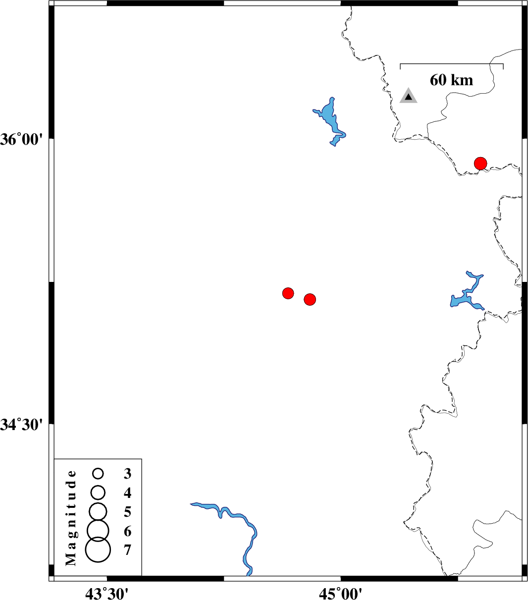 | 2024/02/15 | 12:39:21.9 | 16:09:21.9 | 35.189 | 44.661 | 10 | ML:3.3 | Iraq, 82 km South-West of Sulaymaniyah | ||